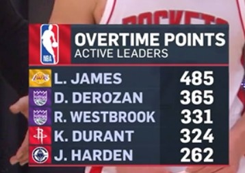 现役加时赛总得分:詹姆斯485分第1 德罗赞2威少3杜兰特4哈登5